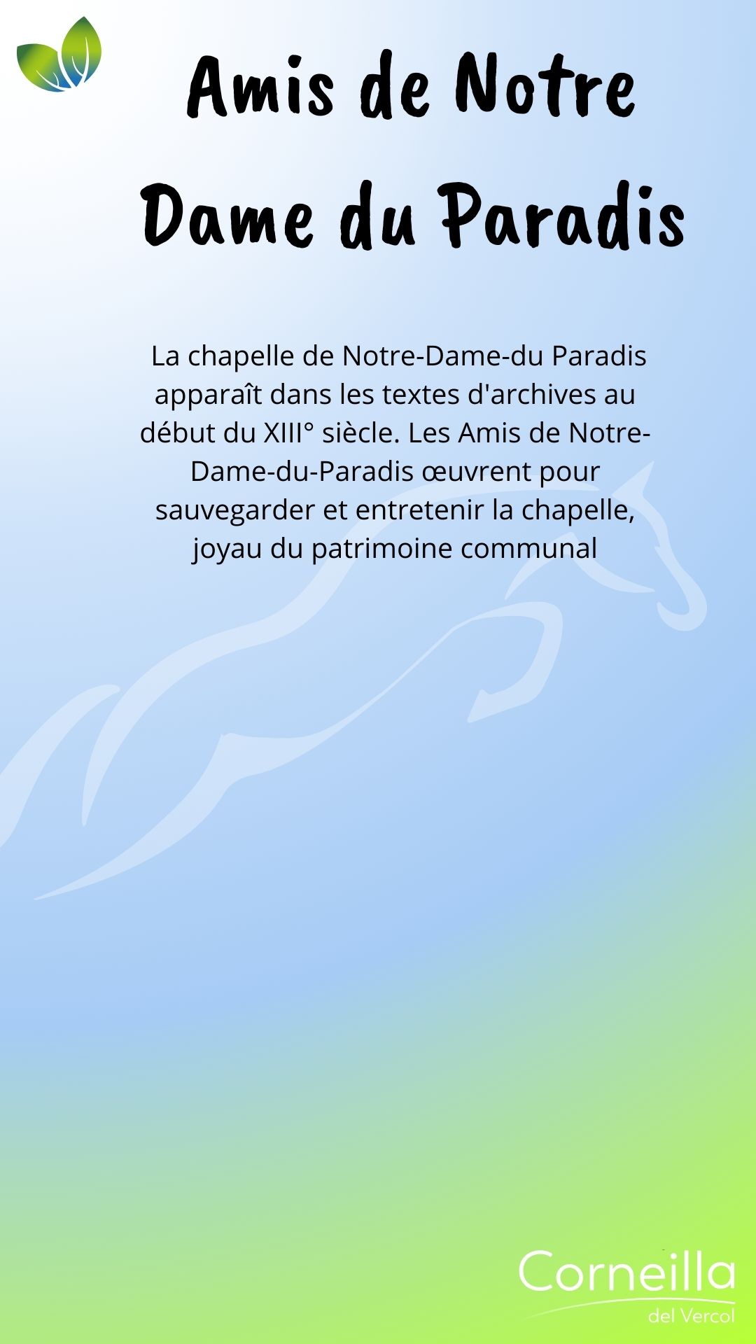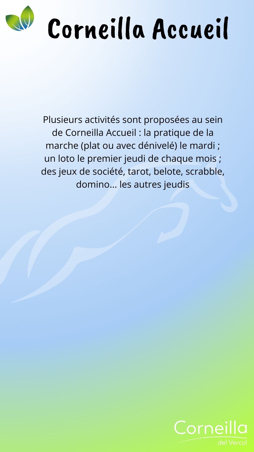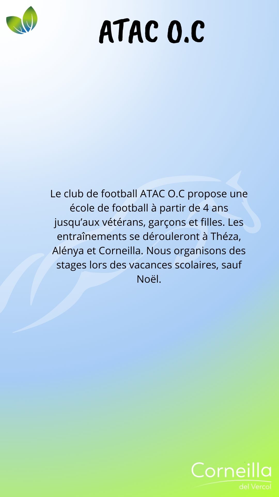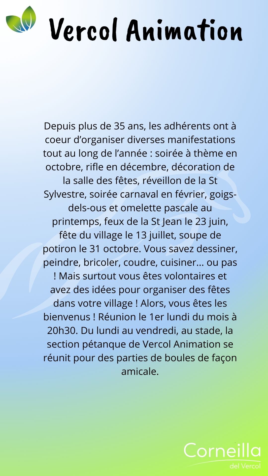 Vie associative SPORT ATAC O.C Ecole de Football 06 85 68 67 82 secretaire.atac@gmail.com Martinez Florian Ass Tennis de Table Corneillanaise 06 07 69 31 08 Gabriel Sicart A.S del Bercol, école de Rugby Ecole de Rugby 06 19 38 74 64 asdelbercol@gmail.com Grégoire Niehaus Estrella esportiva del Rossello 06 77 35 51 12 Romain Melich M.J.C Trobad 06 72 38 56 47 fab.mar66@orange.fr Fabrice Martin Retraite sportive Del Vercol 06 77 16 94 09 retraitesportivedelvercol@gmail.com Maurizio Romano Au cœur du son 06 95 15 66 97 contactaucoeurduson@gmail.com Philippe Lacans Zaidan Karaté Shotokan Club 06 27 11 77 79 zaidan.shotokan@gmail.com Évelyne Cordelle LOISIRS - CULTURE - ANIMATION Amis de Notre-Dame-du-Paradis 04 68 22 73 22 Philippe Jonquères D’Oriola L'Atelier de l'enlumineur 06 16 86 40 54 Joseph Mach Association des Corneilla 04 68 22 62 91 Anne-Marie Amouroux AIV : Association informatique 06 78 69 72 72 clubinformatique@gmail.com Marcelle Boher Corneilla Accueil 06 28 23 06 85 ndelage83@aol.com Nelly Delage Chante ! 06 13 72 34 54 Mathieu Dufort Corneill'Art 06 80 36 99 75 Marie-José Vila L'entrée des acteurs 06 64 28 98 97 bea.lutas@gmail.com Béatrice Moty Lutas Vercol Animation 06 78 29 61 57 mimi.aure@orange.fr Brigitte Masson Les lutins du Père Noël 06 29 10 47 99 leslutinscdv66200@gmail.com Jean-Pierre Garau MÉMOIRE Les Anciens Combattants 06 74 53 39 86 Sylvain Éleaume Le Souvenir français 06 25 04 30 83 René Wallez ÉDUCATION - FAMILLE SANTÉ Les Nin's del Vercol 07 84 96 46 77 lesninsdelvercol@gmail.com Élodie Vanderwée Amicale des donneurs de sang vaunique@hotmail.fr Véronique Planas NATURE A.C.C.A 06 20 60 46 60 accacorneilladelvercol@gmail.com Jean Michel Peralta Les jardins d'Antan Nadège Nénert lesjardinsdantan@free.fr Associations Partenaires Le Secours Populaire 06 56 71 38 75 Françoise Stuber Lire et Faire lire 04 68 81 81 45 06 26 98 71 28 Une équipe à votre écoute Votre mairie répond à vos questions Contactez-nous