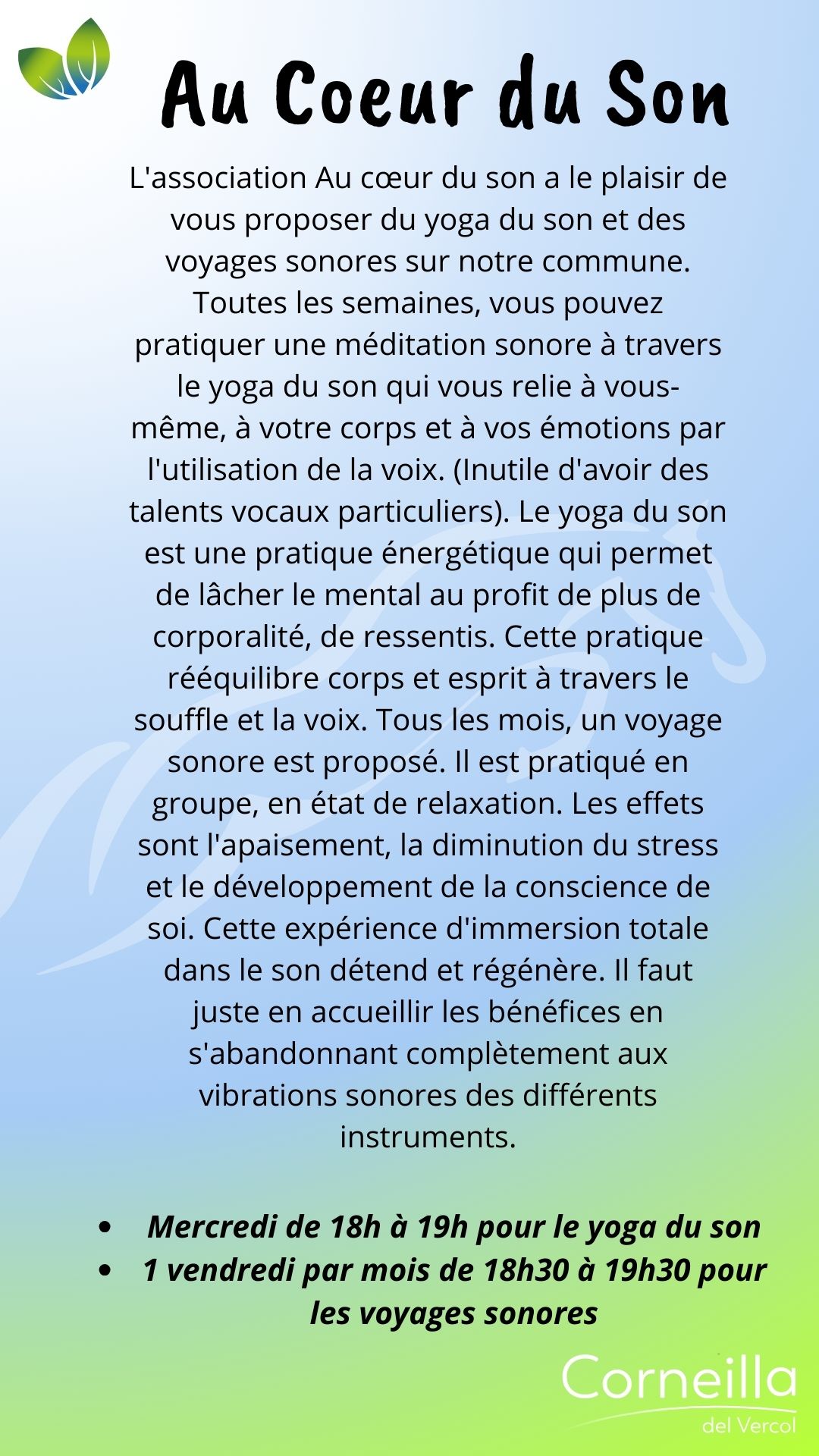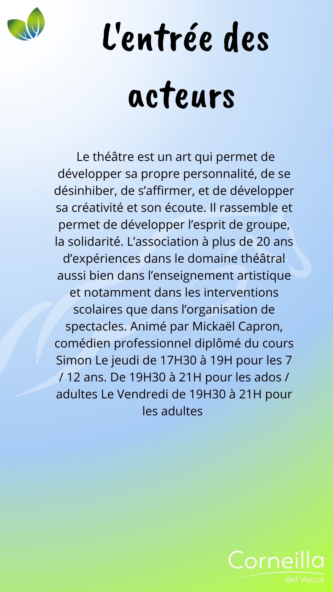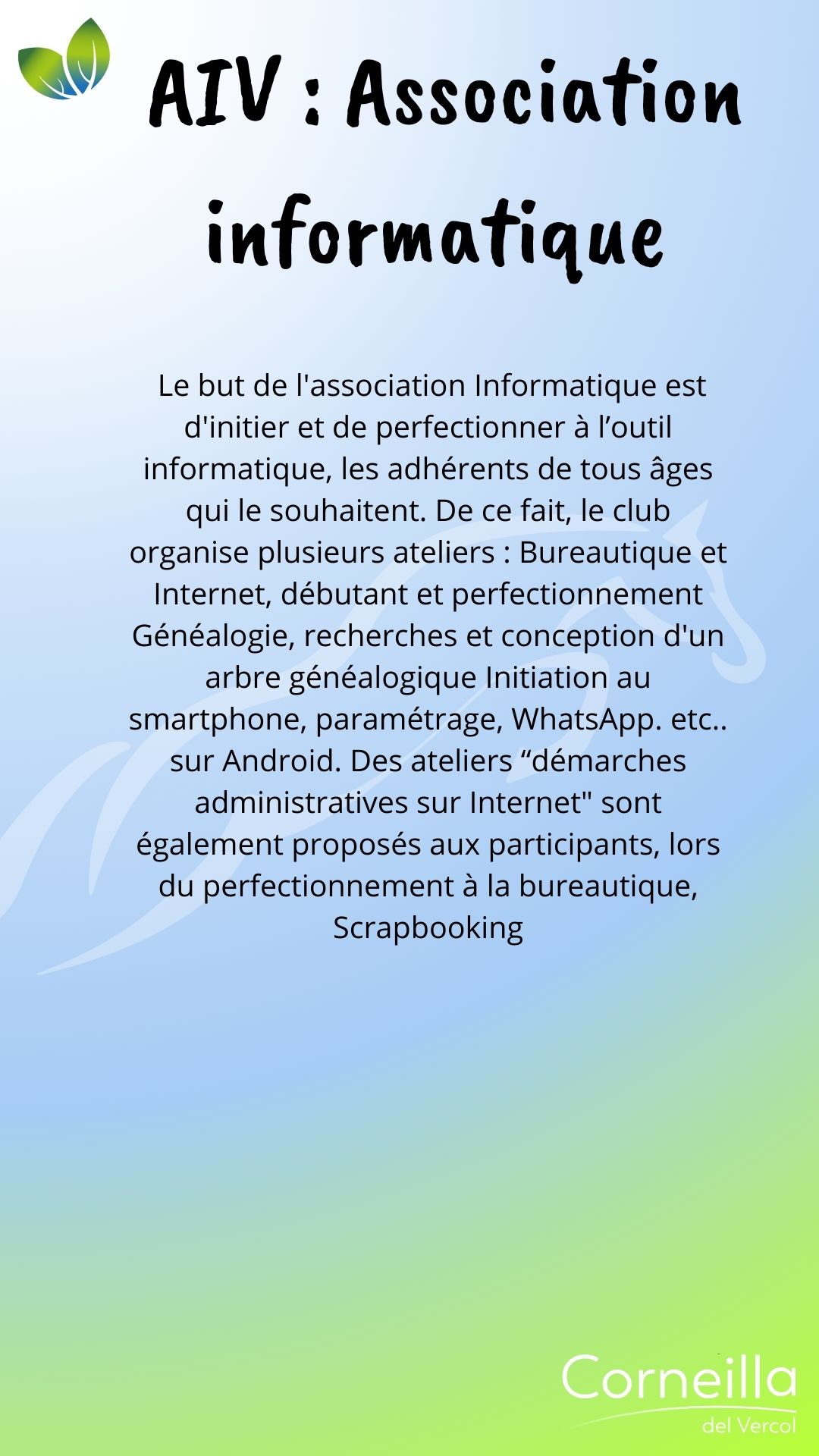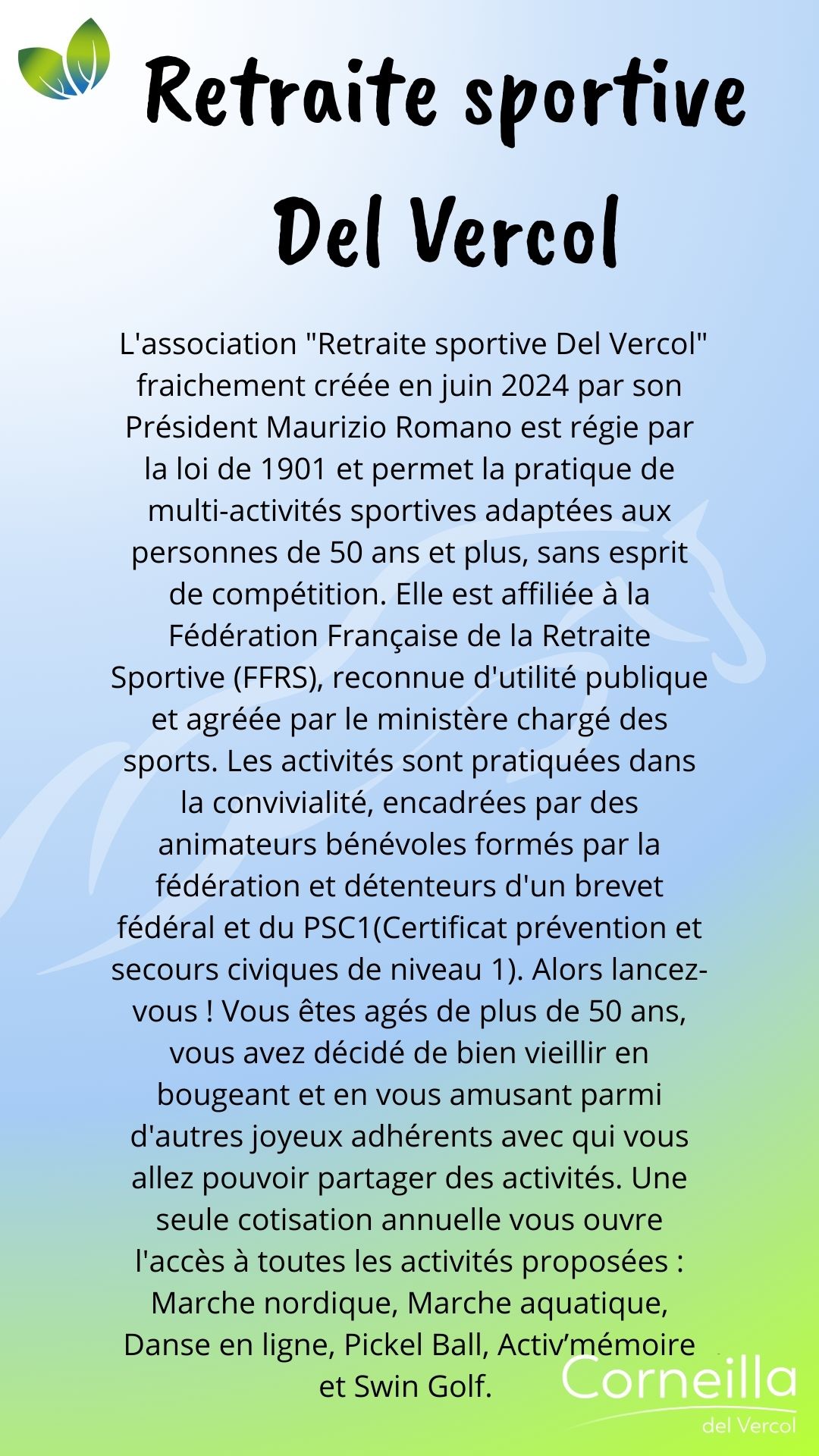 Vie associative SPORT ATAC O.C Ecole de Football 06 85 68 67 82 secretaire.atac@gmail.com Martinez Florian Ass Tennis de Table Corneillanaise 06 07 69 31 08 Gabriel Sicart A.S del Bercol, école de Rugby Ecole de Rugby 06 19 38 74 64 asdelbercol@gmail.com Grégoire Niehaus Estrella esportiva del Rossello 06 77 35 51 12 Romain Melich M.J.C Trobad 06 72 38 56 47 fab.mar66@orange.fr Fabrice Martin Retraite sportive Del Vercol 06 77 16 94 09 retraitesportivedelvercol@gmail.com Maurizio Romano Au cœur du son 06 95 15 66 97 contactaucoeurduson@gmail.com Philippe Lacans Zaidan Karaté Shotokan Club 06 27 11 77 79 zaidan.shotokan@gmail.com Évelyne Cordelle LOISIRS - CULTURE - ANIMATION Amis de Notre-Dame-du-Paradis 04 68 22 73 22 Philippe Jonquères D’Oriola L'Atelier de l'enlumineur 06 16 86 40 54 Joseph Mach Association des Corneilla 04 68 22 62 91 Anne-Marie Amouroux AIV : Association informatique 06 78 69 72 72 clubinformatique@gmail.com Marcelle Boher Corneilla Accueil 06 28 23 06 85 ndelage83@aol.com Nelly Delage Chante ! 06 13 72 34 54 Mathieu Dufort Corneill'Art 06 80 36 99 75 Marie-José Vila L'entrée des acteurs 06 64 28 98 97 bea.lutas@gmail.com Béatrice Moty Lutas Vercol Animation 06 78 29 61 57 mimi.aure@orange.fr Brigitte Masson Les lutins du Père Noël 06 29 10 47 99 leslutinscdv66200@gmail.com Jean-Pierre Garau MÉMOIRE Les Anciens Combattants 06 74 53 39 86 Sylvain Éleaume Le Souvenir français 06 25 04 30 83 René Wallez ÉDUCATION - FAMILLE SANTÉ Les Nin's del Vercol 07 84 96 46 77 lesninsdelvercol@gmail.com Élodie Vanderwée Amicale des donneurs de sang vaunique@hotmail.fr Véronique Planas NATURE A.C.C.A 06 20 60 46 60 accacorneilladelvercol@gmail.com Jean Michel Peralta Les jardins d'Antan Nadège Nénert lesjardinsdantan@free.fr Associations Partenaires Le Secours Populaire 06 56 71 38 75 Françoise Stuber Lire et Faire lire 04 68 81 81 45 06 26 98 71 28 Une équipe à votre écoute Votre mairie répond à vos questions Contactez-nous